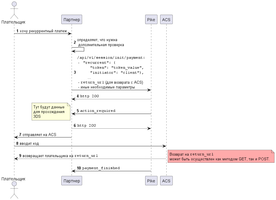 session/init/payment, в запросе передайте значениеpayment_details.recurrent.initiator:clientи URL для возврата плательщика после прохождения верификации 3DS в параметреreturn_url.Пример